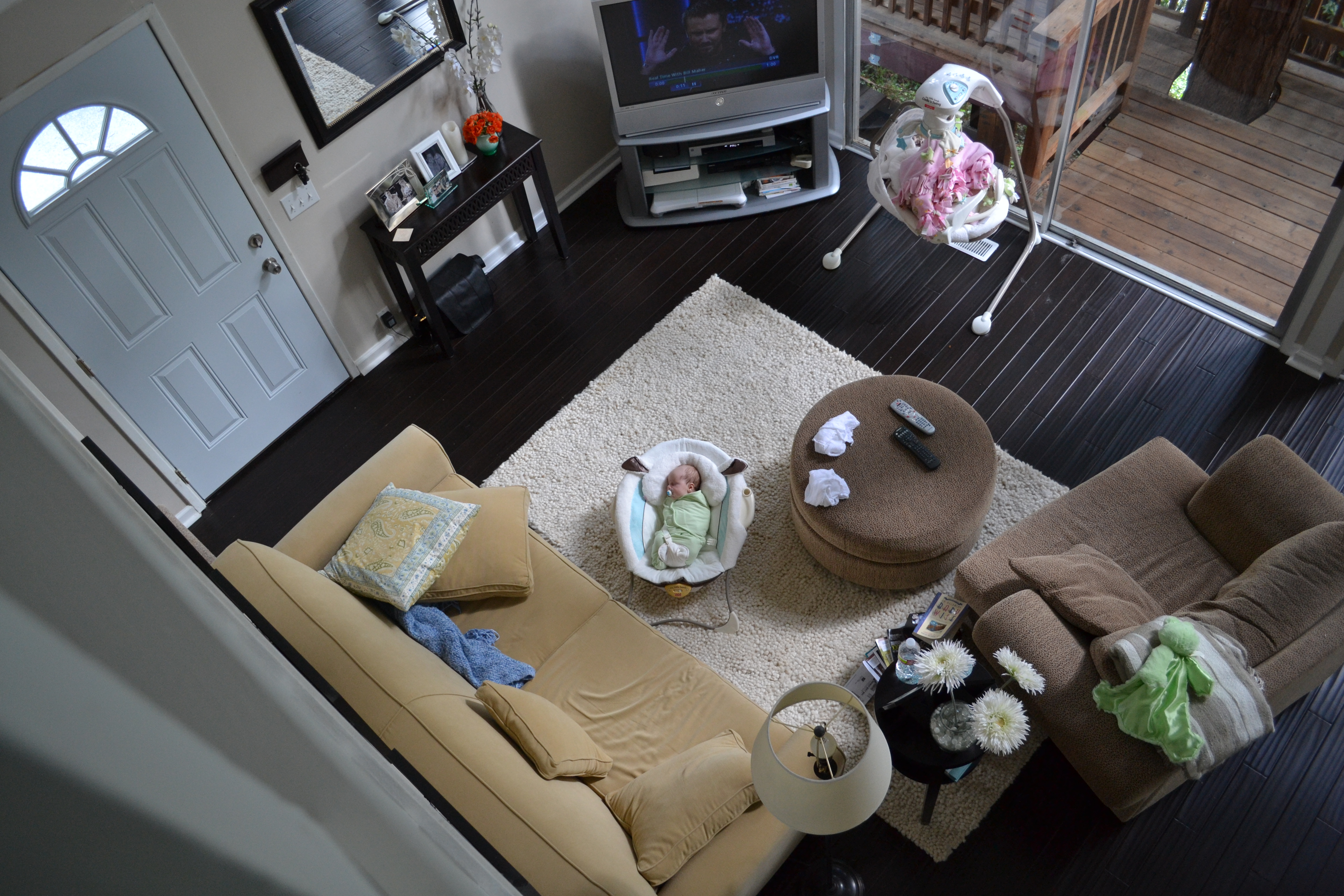 …at times, that feels like all Cam seems to do and for the most part – that is all she does at this point! We have an occassional 15-20 minute-long “awake time”, the daily car trip and subsequent walk outside in the fresh air and a weekly bath, but otherwise, Cameron really likes to ESC. 😉 We broke our sleeping record this week with about an 8-hour stretch which was pretty amazing and she seems to be enjoying her new home in the crib, even beginning to take lengthy daytime naps in her comfy compound. She finally spent more than 5 minutes in the swing and hopefully that fantastic device continues to grow on her.
