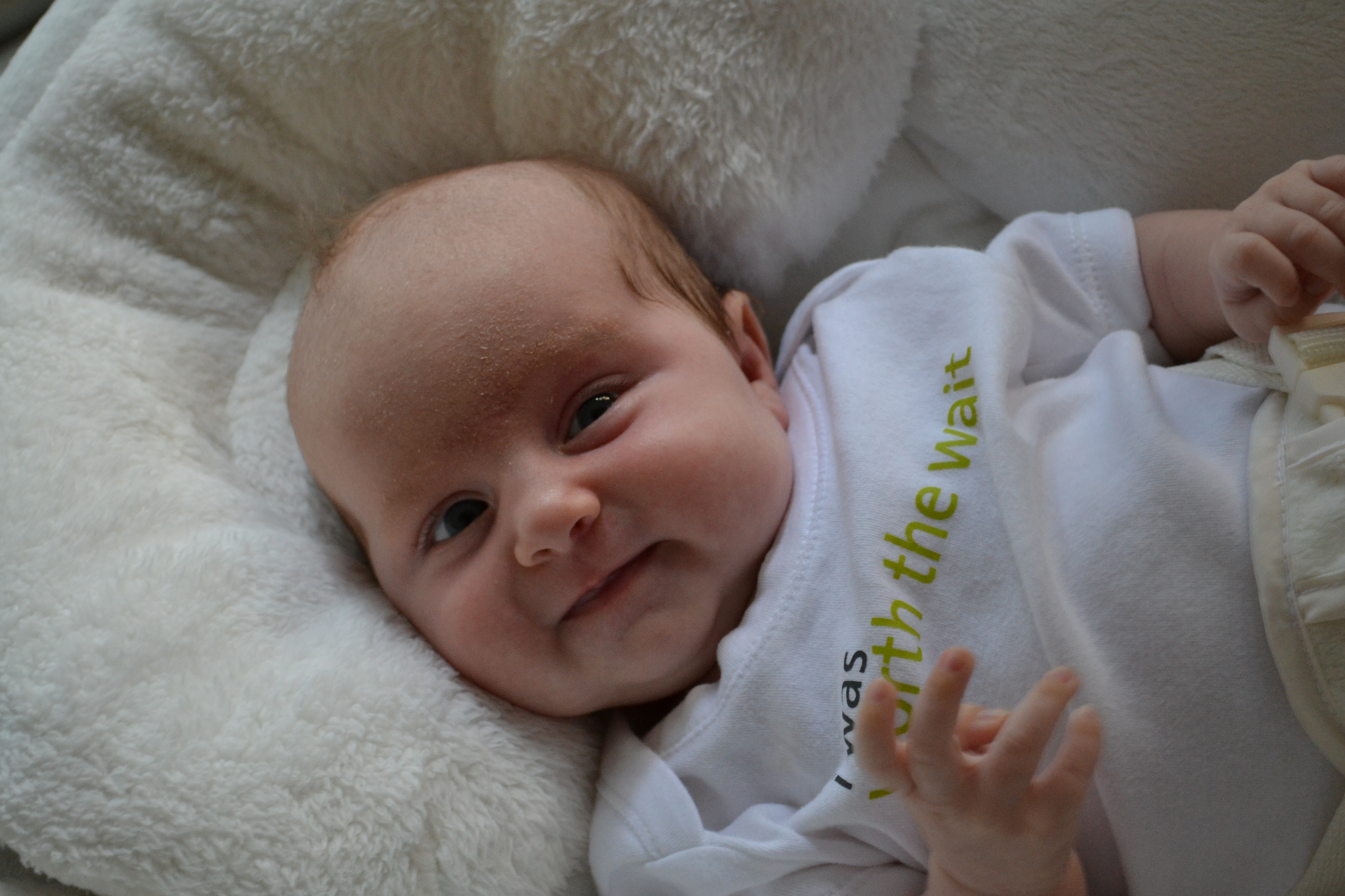 We passed 6-weeks-old this week and like clockwork Cameron began to make serious strides in the smile department. She’s starting to get a pesky case of cradle cap on her forehead, but not even a flaky scalp can detract from her sweet smile.