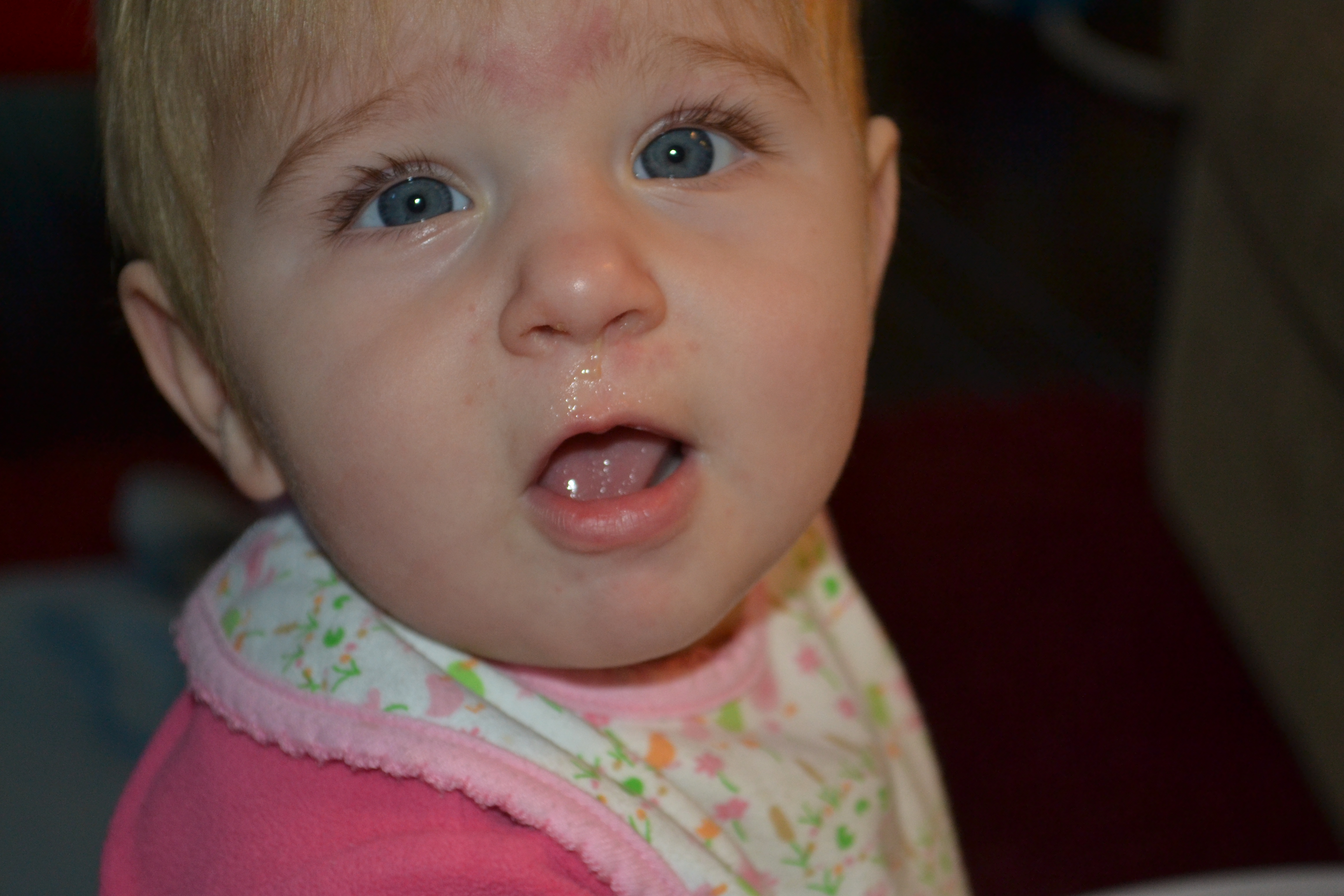 Poor little Cami-bear got her first cold this week…thanks to Daddy (he was sick all week too)! She was actually in pretty good spirits all week even though she was running a fever, coughing a lot and sneezing all over the place. We’ll document her first cold with a close-up of that runny nose. She’s seems to be getting better now, but it was sad seeing her so uncomfortable.